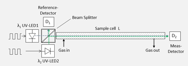 Erste LED basierte UV-Gassensoren wurden von der Wi.Tec-Sensorik GmbH bereits 2014, zur Messung von Schwefeldioxid (SO2) und Stickstoffdioxid (NO2), auf den Markt gebracht. Mit diesen UV-LEDs lassen sich sehr kompakte Aufbauten realisieren, die auch zur Messung von mehreren Komponenten ausgelegt werden können. In Abb. 2 ist ein solcher Messaufbau (ULTRA.sens®) dargestellt. Die UV-LED 1 wird mit einer Frequenz f=10 Hz moduliert und hat ein Emissionsmaximum von λ1=290nm (SO2-Messung). Über einen Strahlenteiler gelangt ein Teil der LED-Strahlung auf einen Referenz-Detektor (D1). Die restliche Strahlung wird in die Messküvette geleitet und dann auf den Detektor D2 fokussiert.