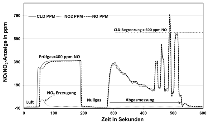 In Abb. 8 ist eine Vergleichsmessung zwischen einem CLD und dem UVRAS-Analysator dargestellt. Zunächst wurden beide Geräte mit Nullgas (Luft) beströmt und dann mit einem Prüfgas (≈400ppm NO) beaufschlagt. Der NO2-Kanal zeigte bei diesem Übergang eine NO2-Konzentration an, da das NO-Prüfgas mit dem Luftsauerstoff zu NO2 reagierte. Nachdem die Messküvette gespült war, fiel der NO2-Wert auf null ab. Danach wurde der Nullpunkt mit Stickstoff kalibriert. Die Abgasmessung, in der nur NO vorhanden war, zeigte eine eindeutige Korrelation zwischen beiden Messverfahren. Oberhalb von 600ppm NO ging der CLD-Analysator allerdings in die Begrenzung, während der UVRAS-Analysator weiterhin plausible Messwerte lieferte.
